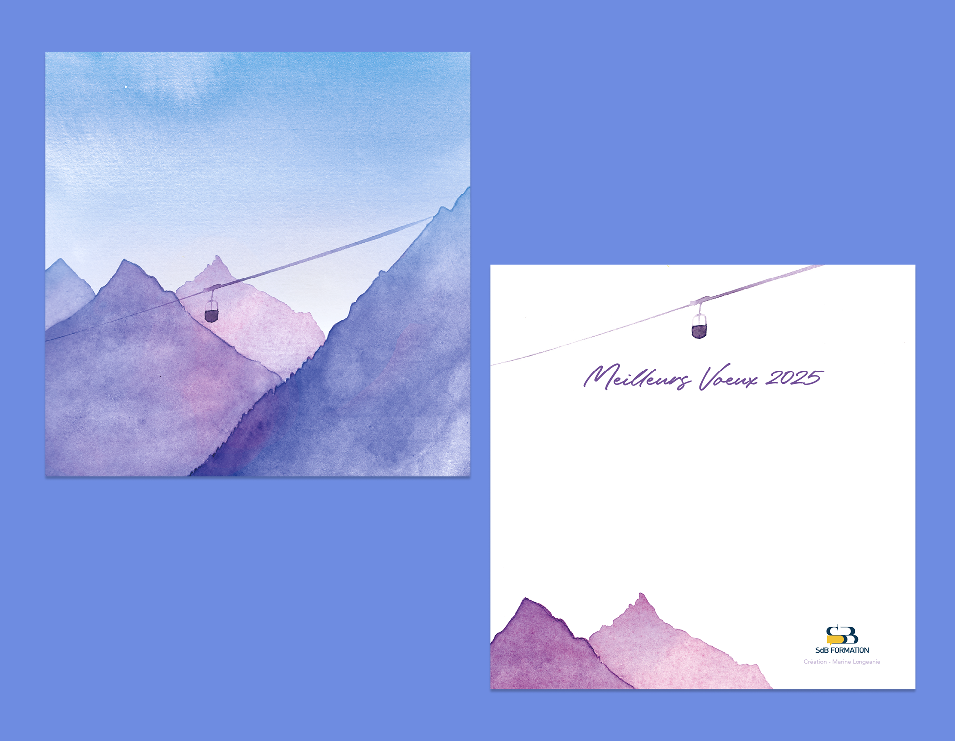 Conception de carte de vœux à l'aquarelle sur-mesure, dans un univers de montagne. Peinture représentant la douceur de l'aube, d'un nouveau jour qui se lève, où l'on prend un peu de hauteur sur l'année passée.