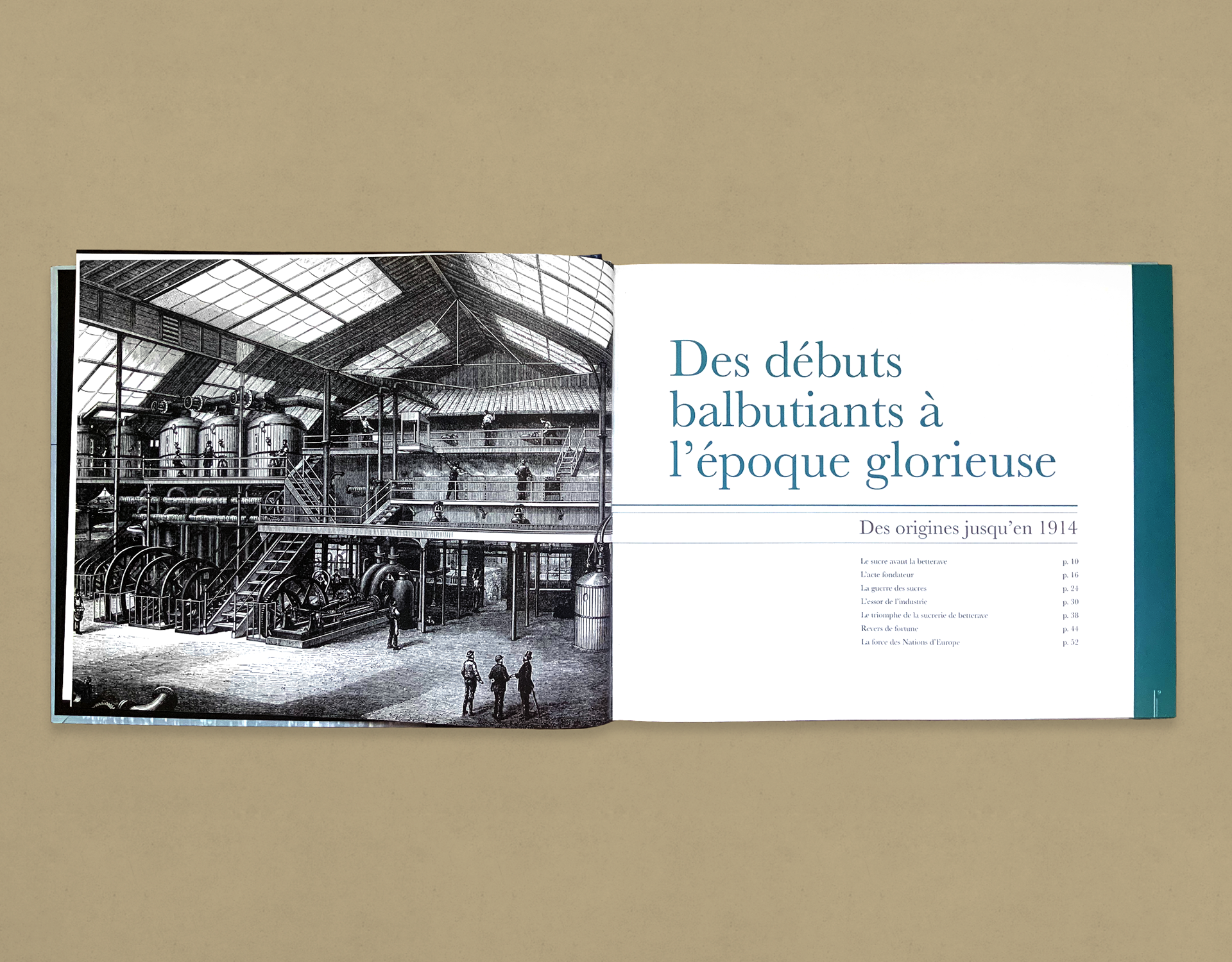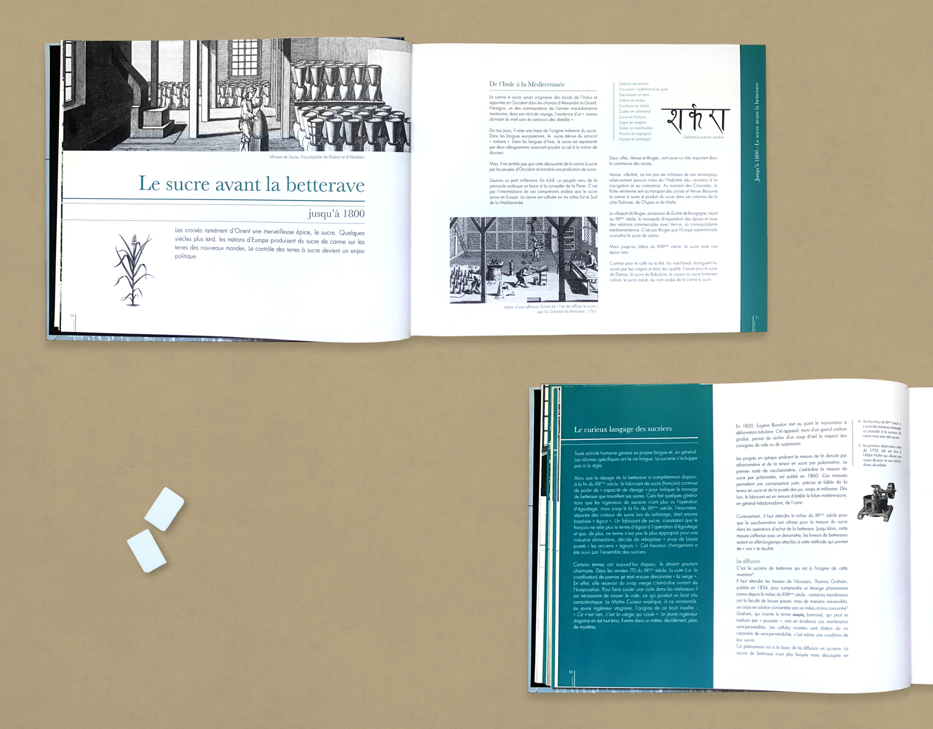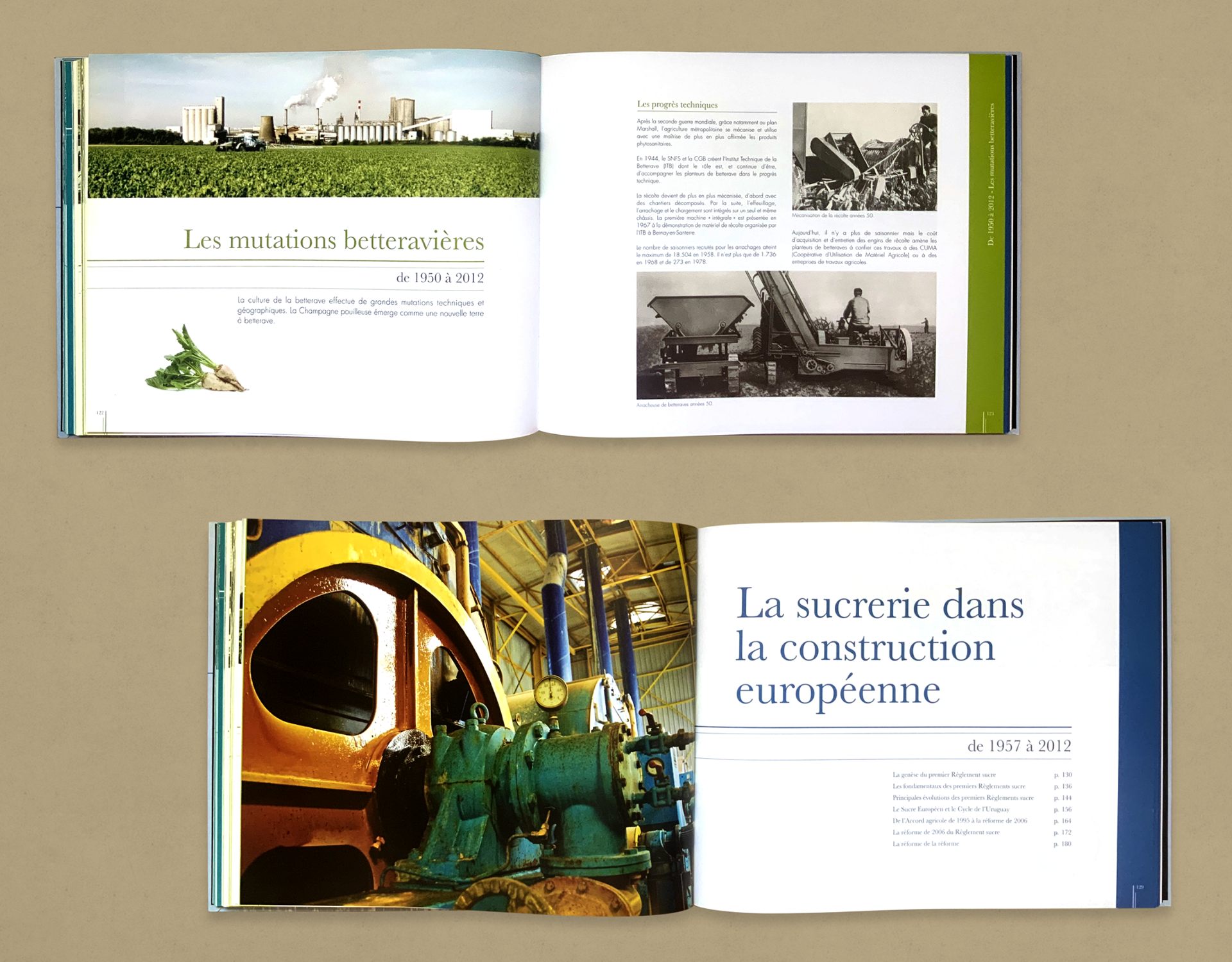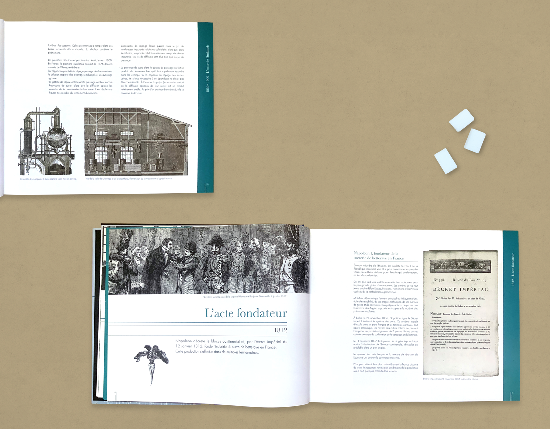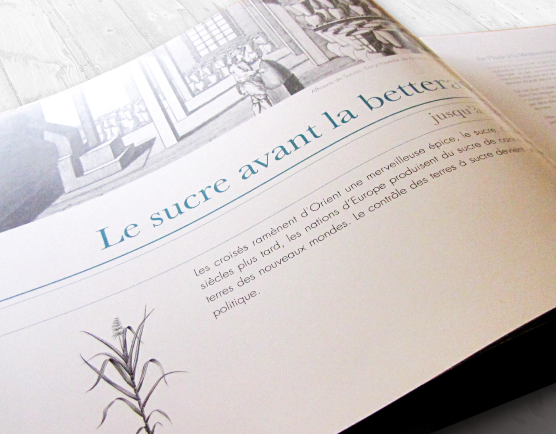 Design graphique du livre des 200 ans de production de sucre pour le Syndicat National des Fabricants de Sucre. Pour ce projet, j'ai réalisé la direction artistique et l'exécution des pages du livre, au sein de l'agence Natcom.